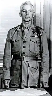 The 29th Marines were sent overseas and participated in the Battle of Okinawa under Bleasdale's command. He was relieved of command on April 11, 1945, and succeeded by William J. Whaling, a decorated World War I veteran, who later was awarded the Navy Cross on Okinawa.[6] Bleasdale was subsequently transferred to the general staff of the III Amphibious Corps, where he Commanded Corps reserve troops on Okinawa.