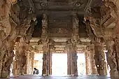 The Mandapas are built on square or polygonal plinths with carved friezes that are four to five feet high and have ornate stepped entrances on all four sides with miniature elephants or with Yali balustrades (parapets).[10] The Mantapas are supported by ornate pillars.[11] The 1,000-pillared style with large halls supported by numerous pillars was popular. The 1,000-pillared Jain basadi at Mudabidri is an example. Larger temples have a separate shrine for the female deity. Some examples of this are the Hazara Rama, Balakrishna and Vitthala temples at Hampi.