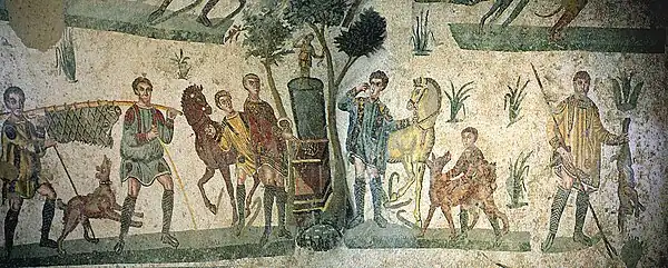 Another well-preserved mosaic shows a hunt, that includes men hunting with dogs and capturing a variety of game.