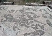 The foyer of the baths is decorated with a mosaic floor of black and white tesserae representing Neptune in his chariot pulled by seahorses. The scene, which unfolds around the centrally positioned god, features: two announcers, a female with a sistrum (an ancient instrument of Egyptian origin) and another male with a flute; a female figure with a fish tail who holds in her hands a thyrsus (a long stick with a pine cone at the end) and various marine animals, including seahorses, a sea lion, a lobster, a shrimp, some fish and a dolphin. To the northeast of the vestibule are two small changing rooms (apodyteria).[15]