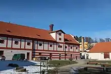 The first mention of a brewery in Vlachovo Březí is from 1623. The Manor Brewery in its current form was founded around 1670 and its capacity caused the gradual demise of breweries in the surrounding villages.[7][8] The Baroque brewery building with distinctive gables was built in the 18th century and forms the western wing of the castle complex. The beer brewing continued until 1924.[9] In 2014–2015, the valuable building was repaired and now it is owned by the town.[7] The beer brewing was renewed in 2017.[8]