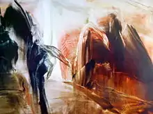 Twenty years brought 'The Island' both worldwide recognition for some individual artists, and also notable losses. One of the most vivid members of the group, the legendary personality of the St Petersburg Bohemia of the 1990s was the artist Vladimir Lisunov. Strikingly handsome, he felt linked by blood with the St Petersburg Silver Age, and always wore a full-length fox fur coat and a wide-brimmed romantic hat. In his pictures Venuses swung on swings, strange philosophizing people wandered around fantastical and slummy cities, his winter scenes exuded longing for his native outskirts of the Leningrad region, in them thoughtful animals, wistful and cosy, and lost country folk came to the foreground. A short documentary film was made about Lisunov when he was alive, in which he recites his convoluted, passionate poetry, talks about his love of fishing, and some kind of morose nuclear energy wafts from the film, and it is clear that Petersburg in the perestroika of the 1990s was the kind of concentration of spirit and creativity which only happens once in a hundred years. Vladimir Lisunov was mysteriously killed by an unknown assailant in 2000. A wave of mysterious killings of artists swept through St Petersburg at the time, as if the city was ridding itself of its already fading stage of turbulent underground , making the transition to a new life, to the gibbering, insipid 2000s.[3]