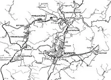 Large coal fields were discovered in the Pechora area in the early 19th century, it was discovered by T.C Bornovolokov in 1809 and various other geologists and explorers from 1828 to 1866. E.K Hoffman, a wealthy entrepreneur, wanted to develop the area for coal mining but couldn't as there were no funds for it.[1][2] In 1930 the geologist Georgy Chernov (1906–2009) discovered substantial coal fields by the river Vorkuta. Chernov's father, the geologist Alexander Chernov (1877–1963), promoted the development of the Pechora coal basin and wrote about it in 1924, which included the Vorkuta fields.[3][4] With this discovery the coal-mining industry started in the Komi ASSR. (At the time only the southern parts of the field were included in the Komi ASSR. The northern part, including Vorkuta, belonged to the Nenets Autonomous Okrug of Arkhangelsk Oblast.) In 1931 a geologist settlement was established by the coal field, with most of the workers being inmates of the Ukhta-Pechora Gulag camp. The Vorkuta camp was established by Soviet authorities a year later in 1932 for the expansion of the Gulag system and the discovery of coal fields by the river Vorkuta, on a site in the basin of the Pechora River, located within the Komi ASSR of the Russian SFSR (present-day Komi Republic, Russia), approximately 1,900 kilometres (1,200 mi) from Moscow and 160 kilometres (99 mi) above the Arctic Circle. The town of Vorkuta was established on 4 January 1936 to support the camp, which was constructed to exploit the resources of the Pechora Coal Basin, the second largest coal basin in the Soviet Union. The camp was constructed mainly for Coal Mining and Forestry, There were approximately 132 sub-camps in the Vorkuta Gulag system during the height of its use in the Soviet prison system. Town status was granted to Vorkuta on November 26, 1943.[3]