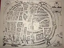 The house originally faced the harbour, near the old weigh house that served as a portage point for ships travelling the IJssel river.[1] The harbour was part of the Grote Aa waterway, a tributary of the Zwarte Water running through the city, which was filled in after cholera outbreaks in the 19th century.[1] In the 1572 map of Zwolle a ship is shown moored in front of this house, which was strategically located next to the Waterpoort, a city gate allowing the passage of ships.