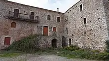 The village's greater area has an elongated shape and runs from the east (near the Langadia mountains) to the west (reaching the river Ladon). On the eastern edge, there are ruins of the mighty Mattegriffon, the Frankish Castle of Akova[3] and every August – over the last 40 years – Vyziki holds cultural activities under the name "Akova Festival". In the same area, namely, inside the castle, under its foundation, and nearby, many items of antiquity have been found – columns, pottery pieces, etc. It has been suggested that it is very probable that Akova existed before the arrival of the Franks; It is located in a place inhabited in antiquity and whose occupation has had to be continuous.[4] This could possibly be the actual location of Ancient Teuthis, mentioned in Pausanias,[5] as many 19th century famous travellers believed, but which nowadays has been claimed by the large village of Dimitsana.Finally, the west end of the Vyziki area enters the region of Ancient Thelpousa,[6] a great city, which is still awaiting an official systematic excavation!