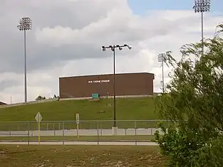 Thorne Stadium was slated to open September 7, 1979, with the Aldine Mustangs hosting the Conroe Tigers. However, workers had not finished installation of the stadium's artificial playing surface and the game was moved to Aldine Athletic Stadium.[26] Eisenhower's season-opener against C.E. King on September 8 was also moved to Aldine Athletic Stadium.[27] Instead, the visiting Houston Lee Generals defeated the home team MacArthur Generals 31-13 in the stadium's first game a week later, on September 14.[28]