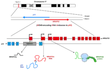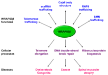 WRAP53 (also known as WD40-encoding RNA antisense to p53) is a gene implicated in cancer development. The name was coined in 2009 to describe the dual role of this gene, encoding both an antisense RNA that regulates the p53 tumor suppressor and a protein involved in DNA repair, telomere elongation and maintenance of nuclear organelles Cajal bodies (Figure 1).[5][6][7][8]