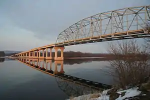 ![]() The bridge reflected in the Mississippi River, seen from upstream on the Minnesota side  | |