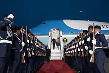 Wachbataillon personnel in Air Force uniforms at the boarding of U.S. President Barack Obama and Michelle Obama on Air Force One at the end of their visit to Germany on 19 June 2013.