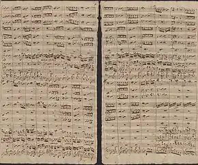 Bach structured the cantata in seven movements. The text and tune of the hymn are kept in the outer choral movements and the central movement, set as two chorale fantasias and a four-part closing chorale, which frame two sequences of recitative and aria.[6] Bach scored the work for three vocal soloists (soprano (S), tenor (T), bass (B)), a four-part choir, (SATB) and a Baroque instrumental ensemble of horn (Co), two oboes (Ob), taille (Ot), violino piccolo (Vp), two violins (Vl), viola (Va), and basso continuo including bassoon.[4][11] The heading of the original parts reads: "Dominica 27. post Trinit. / Wachet auf, rufft uns die Stime / â / 4. Voc. / 1. Violino picolo. / 2. Hautbois. / Taille. / Basson. / 2 Violini. / Viola. / e / Continuo. / di Signore / J.S.Bach."[12] The duration is given as 31 minutes.[6]