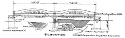 The Wadhams Road Bridge was 150 feet (46 m) long, and consisted of two 70-foot (21 m) curved chord, concrete through-girder spans. The bridge was 28 feet (8.5 m) wide, and carried a 22-foot-wide (6.7 m) roadway with concrete girders on each side, serving as railings. Each girder contained five openings, with a row of 14 recessed square panels below. The bridge sat on a solid concrete pier with slightly pointed cutwaters on each end.[2]