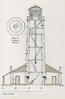 The basement octagon of the tower is 13 metres (43 ft) across and 1.8 metres (5 ft 11 in) thick, being formed from 230 cubic metres (8,100 cu ft) of concrete. The superstructure is 34 metres (112 ft) above this and comprises 760 cubic metres (27,000 cu ft) of hard limestone. The outer diameter is about 9 metres (30 ft) at ground level and the walls are 1.4 metres (4 ft 7 in) thick. At the top of the tower the inner diameter is 3.4 metres (11 ft) and the walls excluding capping are 0.9 metres (2 ft 11 in) thick.[19] The lantern house is 7.6 metres (25 ft) high. Stone for the new tower was transported to the site from a quarry at Nancy Cove, about 1.6 kilometres (1 mi) south-west, along a tramway built for the task.