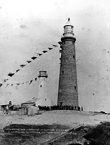 Tenders for the new tower were accepted in October 1894 for £3,237 4s. 9d. from Messrs Parker and Rhodes, and construction commenced in March 1895. The foundation stone was laid on 25 April 1895 by the Premier of Western Australia, Sir John Forrest[2] and included the placement of a glass bottle in a niche in the stone, containing newspapers, coins and copies of plans of the new lighthouse.[19] It was designed by British engineer William Douglass with construction overseen by the colony's engineer-in-chief, C. Y. O'Connor. Douglass also designed the Cape Leeuwin Lighthouse, which was built between 1895 and 1896.[20][21]