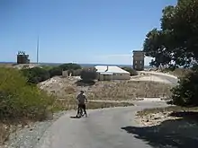 The first keeper, Samuel Thomas, was appointed on 18 January 1849—two years before the light was lit. Thomas's duties initially included operating a system of signalling using flags and flares to indicate the arrival of ships. Different signals and flag combinations indicated ships to the north or south of the island and these were monitored from a pilot's lookout at Bathurst Point on the north-eastern extremity of the island and then relayed to Arthur Head at Fremantle. Four flagpoles were built at the lighthouse for signalling.[11] The flags were about 9 feet (2.7 m) square. When confirmation of a ship's arrival was received, the lookout man at Arthur Head raised a blue flag for the information of Fremantle residents.[12]