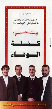 Wafaa Bloc (Arabic: كتلة الوفاء) was a candidature list that contested the May 2005 municipal elections in Bethlehem, the West Bank. The list was officially supported by the Islamic Jihad Movement in Palestine. In total, the Bloc presented 4 candidates. The top candidate of the Bloc was Nasser Isa Hassan Shauka.[1]