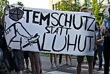Worker protest for mining respiratory protection over basic material. Banner reading: "respiratory protection over aluminum hats" Germany on June 22, 2020