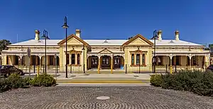 The station building, categorised as a New South Wales Government Railways Type 5 made of first-class brick, and a two-storey Type 4 brick stationmaster's residence, were completed in 1879. In 1917, a refreshment room was added for the journey to Albury. A footbridge from Station Place to Railway Street was completed in 1936.[7] The station yard had a turntable, a tripod crane and extensive sidings, including to an offsite fuel depot and grain silos, but they were removed to leave only a passing loop and short stand-by loop in use. The station no longer has freight handling facilities.