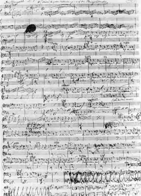 The composition of Das Rheingold occupied Wagner from 1 November 1853 to 26 September 1854. He began by developing a preliminary draft (Gesamtentwurf) of the entire work from his sketches. This 77-page draft, which was written in pencil and on two (sometimes three) staves, was completed by 14 January 1854. The following month (1 February) he proceeded to make a second complete draft. It seems that his first intention was to make a composition draft in ink, just as he had done for Lohengrin, but as such a draft of the opening Prelude – which consists of little more than an arpeggiated E major triad – would have been to all intents and purposes a full score, he decided to skip the intermediate stage and draft the full score in ink right away. This he proceeded to do with the Prelude, significantly revising some of its details in the process.[4] When, however, he reached the beginning of Scene 1, he found that the remainder of the opera required too much revision and elaboration to allow him to develop a full score without first making a second complete draft. He therefore abandoned the full score in ink and proceeded to develop instead an instrumentation draft in pencil, in which he worked out most of the vocal and orchestral details of the four remaining scenes. This Instrumentationsskizze, as Wagner himself styled it, was completed by 28 May 1854.
