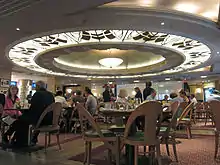 The west lounge, originally the Peacock Alley, runs in a north–south direction, connecting the Park Avenue lobby and colonnade to the west and the west elevator bank to the east. It contains wooden paneled walls and red-marble pilasters with silver Ionic capitals. The northern portion of the west lounge has been converted into a restaurant area.[185] This space contains the Peacock Alley restaurant, which includes the main restaurant, a bar and lounge, and three private dining salons.[31] The southern portion remains intact and contains a set of decorative metal gates that formerly led to a beauty salon.[185] The west elevator lobby consists of a bank of six elevators with stainless steel doors that contain bas-reliefs of women. The elevator lobby also has a carpet, wooden paneling around the elevator doors, and a stepped ceiling with crystal chandelier.[186] The elevators are furnished with paneled pollard oak and Carpathian elm.[187]