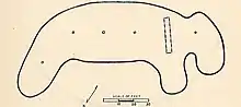 The 1921 excavations focused on the burial mounds present on the site. There were at least 6 groups of mounds, and a total of 38 burials were recovered. Mound 1 of Mound Group 4 was interesting in that it was shaped in the form of a bear effigy.[2]