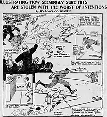 Goldsmith was among the corps of writers providing coverage of the World Series games. The Boston Globe summarized his role as: "The Globe's own cartoonist will attend every game in the series, and no bit of humor will escape his eye. When he draws a likeness of Jake Stahl-you will know it's Jake, and so it will be with the other warriors, who will be caught in characteristic attitudes truer to life than would be possible in any photograph. Goldsmith will see the crucial plays in every game and will picture them in his graphic in a funny way."[14]