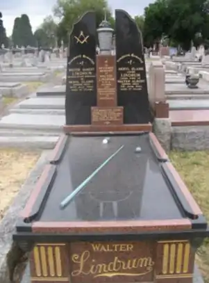 His body was returned to Melbourne, and he was given a state funeral attended by 1,500 people.[5] He was buried at Melbourne General Cemetery, with champion cyclist Sir Hubert Opperman raising the funds for a distinctive monument consisting of a billiards table, complete with balls and cue; more than fifty years after his death the site reportedly remains the most visited grave in this substantial cemetery.[5]