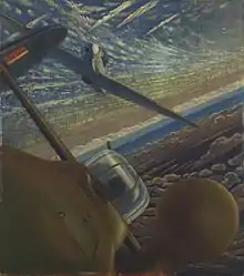 In May 1939, Monnington joined the Directorate of Camouflage at Leamington Spa where he worked on camouflage designs for airfields and factories. He also, after a chance meeting with Barnes Wallis, contributed design improvements, now in the Victoria & Albert Museum, to a new heavy bomber aircraft then being developed which later became the Avro Lancaster.[5] In 1943 Monnington, who had taken flying lessons before the war, wrote to the War Artists' Advisory Committee, WAAC, complaining of the lack of an aerial perspective among the works WAAC had so far commissioned.[6][5] In November 1943, WAAC issued Monnington with the first of a series of full-time commissions that saw him flying with a training squadron in Yorkshire and with Mitchell bombers to Germany. The winter of 1944-1945 was spent in the Netherlands amongst the Second Tactical Air Force drawing mobile radar and radio units.[1] The paintings Monnington produced of aerial warfare,[7] and especially those such as Fighter Affiliation.[8] from a perspective inside the aircraft, were to be among the most important such images in the WAAC collection.[6][9]