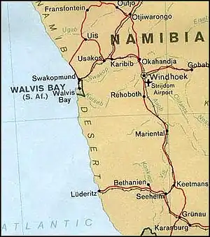 Map showing location of Walvis Bay and reference to South Africa before the handover to Namibia