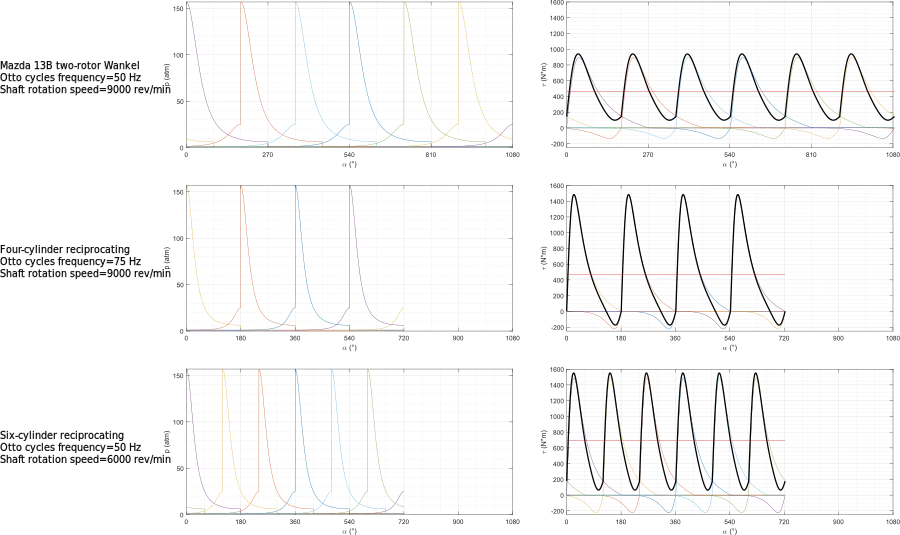 With this values, a single-rotor Wankel engine produces the same average power to a two-cylinder four-stroke engine, with the same average torque, with the shaft running at the same speed, operating the Otto cycles at 3/2 the frequency.