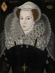A masque in December 1563 involved three large blue velvet Swiss bonnets and wigs. There was also a blue velvet bonnet for Nichola the Fool, and Mademoiselle Rallay was given canvas to fashion wigs.[80] The occasion may have been her twenty-first birthday, where she tired herself with "dancing over long".[81] Mary's tailor Jehan de Compiegne made costumes from orange "changing" or shot taffeta for a masque in February 1565 at Holyrood Palace, with a smaller costume in the same fabric for a young girl at court. The English ambassador Thomas Randolph the describe Twelfth Night masques and banquets of February 1564. The four Maries and the queen's ladies wore white and black at one banquet,[82] and verses were recited as the courses were brought in by gentlemen wearing black and white.[83] Mary herself in white and black with white and black lace at her neck wore no other jewels except a diamond ring, a gift from Elizabeth I, worn as a pendant.[84] Mary seems to have emulated the fashion of other courts by dressing herself and her ladies in black and white for the masque, echoing colours adopted by Diane de Poitiers.[85]