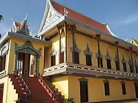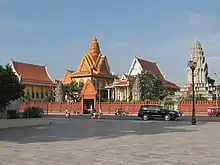 Wat Ounalom (Khmer: វត្តឧណ្ណាលោម, UNGEGN: Vôtt Ŭnnaloŭm, ALA-LC: Vatt Uṇṇālom, IPA: [ʋɔət ʔunnaːloːm]; also Wat Unnalom and several other spellings) is a wat located on Sisowath Quay in Phnom Penh, Cambodia, near the Royal Palace of Cambodia.[1] As the seat of Cambodia's Mohanikay Order, it is the most important wat of Phnom Penh, and the center of Cambodian Buddhism. It was established in 1443 and consists of 44 structures.[2] It was damaged during the Khmer Rouge period but has since been restored.[2] The main complex houses a stupa that contains what is believed to be an eyebrow hair of The Buddha and an inscription in Pali.[2]