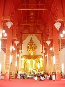 The temple's wihan hosts a 16 metres (52 ft) high, 14 metres (46 ft) wide Buddha statue (Phra Chao Ton Luang) in the angular local style of the 15th and 16th centuries.[1][4] Surrounding the wihan are 38 Buddha heads, some cast in the local Phayao pink sandstone, dating from the 14th century.[2][5]