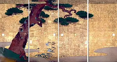 His earliest works are done in the style of the Kanō School, then show the influence of Ogata Kōrin, so they can be approximately dated. Typical of the Kanō period are screens and wall paintings, for the Kombu-in Zen temple in Nara. His paintings for the fusumas (sliding doors) at the Daikaku-ji Biddhist temple in Kyoto are in the Ogata style.