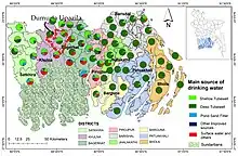 In June 2019, the Department of Public Health and Engineering (DPHE), the national lead agency for provision rural water supply, reported a total of 1.8 million waterpoints, of which 91% were functional. These waterpoints included 1.27 million shallow and 0.47 million deep tubewells, while the remaining are split between pond sand filters, ringwells and rainwater harvesting systems.[24] Tubewells serve as the main source of drinking water in rural Bangladesh, with access to water for rural populations increasing from 65% in 1990 to 97% in 2015.[24]