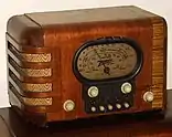 The style was distinguished by numerous features. It was named "Waterfall" due to its distinctive rounded drops at the edges of all horizontal surfaces, thought to resemble a flowing waterfall. Pieces in this style were usually finished with a blond veneer, though a small percentage were finished in a darker walnut finish. Drawer faces on more expensive Waterfall furniture often featured unusual designs such as decorative crossbanding and bookmatched panels. Handles were typically of orange Bakelite and brass, and some vanities had illuminated spheres or frosted panels.[1] Pieces in this style were sometimes paired with oversized round mirrors with etched trim.[1] The furniture was made with plywood, which would be molded during manufacturing.[3] Higher-quality pieces would feature the Waterfall curve in molded plywood where the plywood softened edges of side corners. Mass-produced Waterfall furniture often simply featured a quarter-round edge.[4]