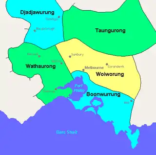 | Boonwurrung, Dja Dja Wurrung, Taungurung, Wurundjeri see List of Indigenous Australian group names |
