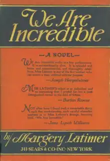 We Are Incredible is Margery Latimer's first novel, published in 1928. It tells the story of a small-town woman, Hester Linden, and her cult-like influence on a small band of followers, leaving them virtually lifeless. The novel was partly based on the sometimes manipulative influence that Zona Gale had on Latimer.[1] Linden's physical appearance is closely modelled on Gale's.[2]