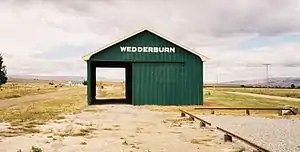 Wedderburn is on State Highway 85 close to the Otago Central Rail Trail.[1] Originally a coaching stop, Wedderburn became a terminus on the Otago Central Railway in 1921 and was the headquarters for the Public Works Department during construction of this section of the line. The section through Wedderburn was eventually abandoned due to a decline in traffic. The line was sustained during the 1980s carrying materials for the Clyde Dam, which inundated the stretch of the line between Clyde and Cromwell, but when the dam was finished, the traffic on the line was below sustainable levels and it was officially closed.