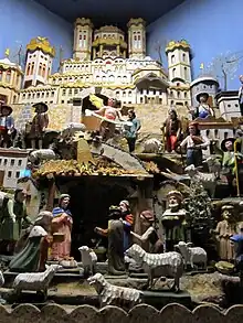 A Weihnachtsberg is a decorative, mountain-like model of the landscape of the Ore Mountains (between Germany and the Czech Republic), which is set up indoors during the Christmas period. It portrays the nativity scene and mining motifs as well as local themes. The figures and objects are often movable and mechanically driven.