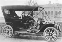 The six-cylinder Touring car had a very long hood, ornate multiple twist horn, acetylene tank, zig-zag windshield, separate step leading up to the rear seat, sweeping front fenders, and long sloping top straps.[1] A four-cylinder baby tonneau was also offered, this with a shortened wheelbase.[1]
