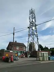 The windmill at the top of the village is believed to have been constructed in 1730.[3] It was described as "a powerful corn mill consisting of four pairs of mill stones and one flour machine" when advertised for sale in 1804.[4] It stopped grinding corn by the end of the century, though would instead be used to grind coal to make briquettes.[4] By 1905 it was used only to serve as a stand for a small turbine, which generated electricity for the public house next door.[4] During World War II the local home guard based their headquarters there.[3] It now houses communication equipment after being bought by the Midlands Electricity Board in 1952, and is now owned by E.ON.[3][4] It remains the last remaining windmill in the Staffordshire Moorlands after Dilhorne's windmill disappeared by the year 1900.[4]
