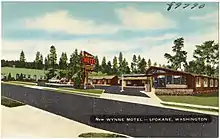 West Hills became a regional transportation hub with the construction of the first automobile bridge over the deep Latah Creek gorge in 1911, when the Sunset Boulevard Bridge was built. It connected Downtown Spokane with agricultural areas to the west via West Hills along Sunset Boulevard.[5] In 1926, the Sunset Boulevard Bridge was chosen to carry U.S. Route 10, one of the first major east–west highways across the northern tier of the country. Numerous motels and campgrounds were developed in the area just west of the bridge at the base of Sunset Hill. A tourist camp was established at what is now High Bridge Park[6] and along Sunset Boulevard itself motels were developed. Many stand to this day, though few remain operational.[5][7] The area's importance in transportation waned in the 1960s as Interstate 90 was constructed roughly parallel to the Sunset Highway. U.S. Route 10 replaced by the limited-access freeway, which passes next to but does not have off or on ramps connecting directly to the motel district. In the decades since, hotels and motels have been developed at the top of the hill, on the western edge of the neighborhood, where there are ramps connecting West Hills to the interstate.[8]
