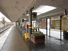 Through electric services commenced on 13 March 1938, when the LMS electrified the lines from Birkenhead Park to West Kirby.[9] The service was provided by the then-new LMS electric multiple units. However, on Sunday mornings, the service was provided by the older Mersey Railway electric units[10] which, up until that point, had only ever run from Liverpool to Birkenhead Park. The 230 ft (70 m)[7] concrete platform awning was erected, at the time of the 1938 electrification, along with a similar structure at New Brighton.[11][12] However, the station building, across the end of the tracks, was left untouched from Victorian times.