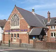 Members of Zion Chapel established a daughter church in nearby Turners Hill in 1824. It was rebuilt in 1906 but was still part of the Countess of Huntingdon's Connexion; since then it has become an independent Free Church.[9][12] In April 1847,[13] a schism occurred in Zion Chapel's congregation: some members left and founded a new Congregational church. After worshipping in hired rooms around East Grinstead, they built Rocks Chapel as their permanent place of worship; the building held its first service on Good Friday 1850.[13][14] The building was later used by Methodists, but it was demolished after they opened a permanent church of their own. Rocks Chapel stood on Old Road in East Grinstead.[13][14]