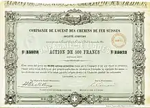 The West Switzerland Company (French: Compagnie de l'Ouest-Suisse, OS) was a railway company in Switzerland, formed 1854 and absorbed into the Western Swiss Railway in 1872. The OS built a railway network in western Switzerland and connected with France via Geneva in 1858, although Switzerland's first railway was the French Strasbourg–Basel Railway (French: Chemin de fer de Strasbourg à Bâle), which connected Basel with Strasbourg, France in 1844.