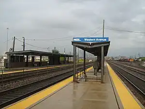 Western Avenue (also known as Western Avenue & 18th Place) is a station on Metra's BNSF Line located in Pilsen neighborhood of Chicago, Illinois. The station consists of one side platform and one island platform for outbound and inbound trains. The station has no station house, though shelters are provided. Amtrak and BNSF Railway trains run on tracks parallel to the station. The station is 3.7 miles (6.0 km) away from Union Station, the eastern terminus of the BNSF Line.[2] As of 2018, Western Avenue is the 208th busiest of Metra's 236 non-downtown stations, with an average of 57 weekday boardings.[1]