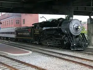 On July 20, 1997, No. 734 pulled ten CSX hopper cars for a WMSR photographer charter, which was organized by Carl Franz.[27][23] The locomotive was subsequently used to pull freight trains for additional photo charters in the following years.[4][28][29] As No. 734 continued to operate, the WMSR earned the locomotive the nickname "Mountain Thunder".[29][30][31] In 1998, the locomotive was modified with an automatic coal stoker, allowing for easier labor for the fireman during the summer months.[32] That same year, No. 734 was being filmed for a television commercial that promoted the Pontiac Montana minivan.[33] In July 2003, the National Railway Historical Society (NRHS) hosted an Amtrak train trip from Baltimore to Cumberland, and the passengers were transferred to the WMSR for a trip between Cumberland and Frostburg behind No. 734.[34]