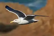 The western gull is a large gull that can measure 55 to 68 cm (22 to 27 in) in total length, spans 130 to 144 cm (51 to 57 in) across the wings, and weighs 800 to 1,400 g (1.8 to 3.1 lb).[3][4] The average mass among a survey of 48 gulls of the species was 1,011 g (2.229 lb).[5] Among standard measurements, the wing chord is 38 to 44.8 cm (15.0 to 17.6 in), the bill is 4.7 to 6.2 cm (1.9 to 2.4 in) and the tarsus is 5.8 to 7.5 cm (2.3 to 3.0 in).[3] The western gull has a white head and body, and upperparts or mantle is dark grey. The head generally remains white year-round, developing little to no streaking in northern populations. It has a large and bulbous-tipped yellow bill with a red subterminal spot (this is the small spot near the end of the bill that chicks peck in order to stimulate feeding). The eye colour varies, averaging pale yellow in southern populations and darker in northern populations. It closely resembles the slaty-backed gull (Larus schistisagus) of Asia, but the latter species has paler eyes and deeper pink legs and eye orbitals. In the north of its range it forms a hybrid zone with its close relative the glaucous-winged gull (Larus glaucescens). Western gulls take approximately four years to reach their full plumage,[6] their layer of feathers and the patterns and colors on the feathers. In adult plumage, The largest western gull colony is on the Farallon Islands, located about 26 mi (40 km) west of San Francisco, California;[7] an estimated 30,000 gulls live in the San Francisco Bay area. Western gulls also live in the Oregon Coast.[8]