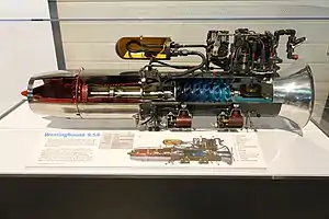 | Cut-away Westinghouse 9.5A/J32 turbojet engine on display at the Steven F. Udvar-Hazy Center | |