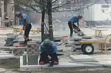 The current park and mall were proposed by the Central Association (now Downtown Seattle Association) in 1968; they took 20 years to come to fruition. Multiple lawsuits were filed throughout this time and continued after the park's opening in October 1988.[9][10] The project was marred by a design flaw, the so-called "Nightmare on Pine Street",[11] that resulted in cracked granite pavers along Pine Street and into the intersection with Fourth Avenue. The city sued the designer and won an out-of-court settlement of $515,000, enough to cover the $472,000 repair and nearly equal to the cost of the original installation.[12] Repairs began in June 1989.[13][14]